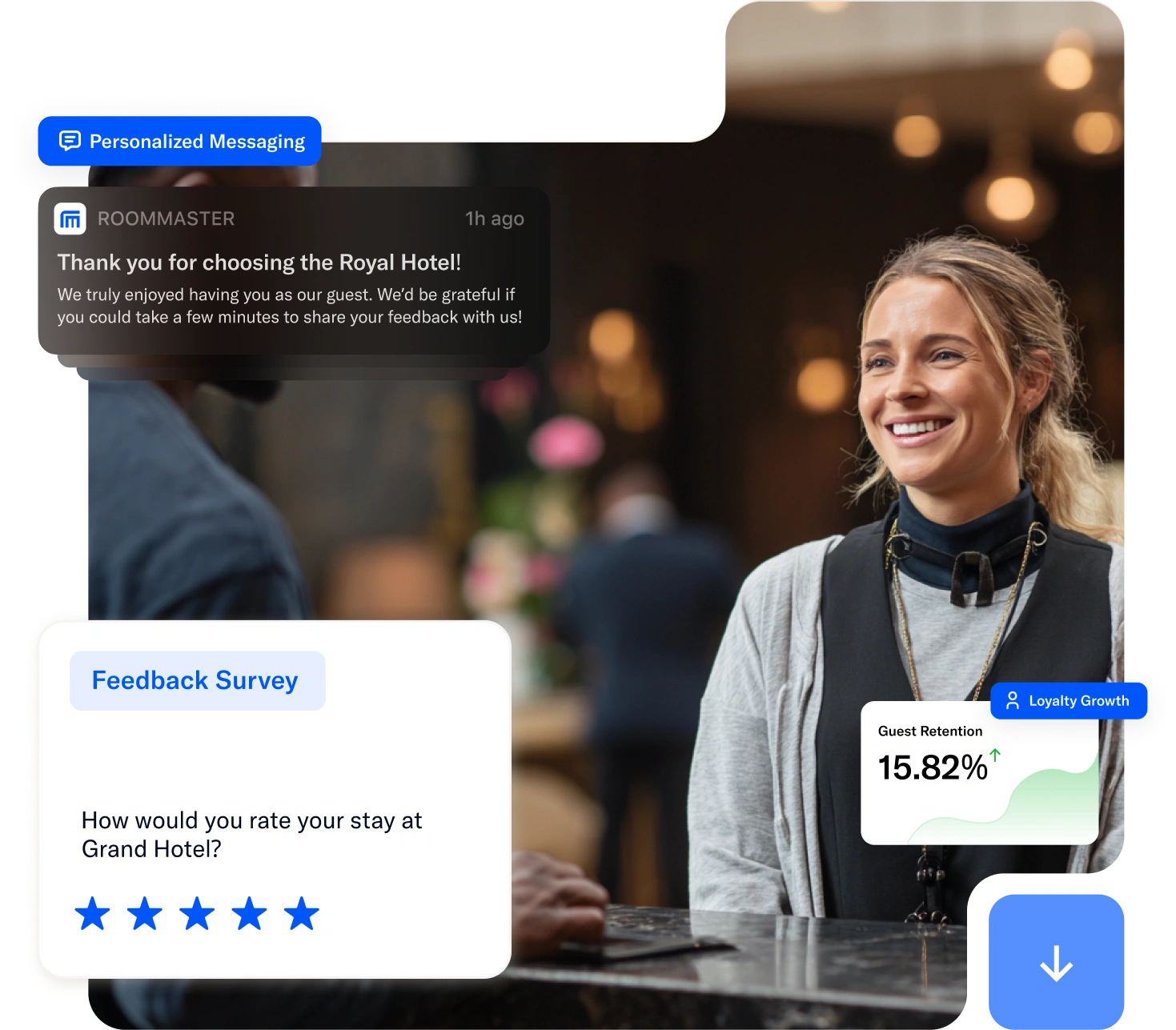 “Our guest feedback scores improved significantly! roommaster’s engagement tools make it easy to send updates, offers, and thank-you messages.”