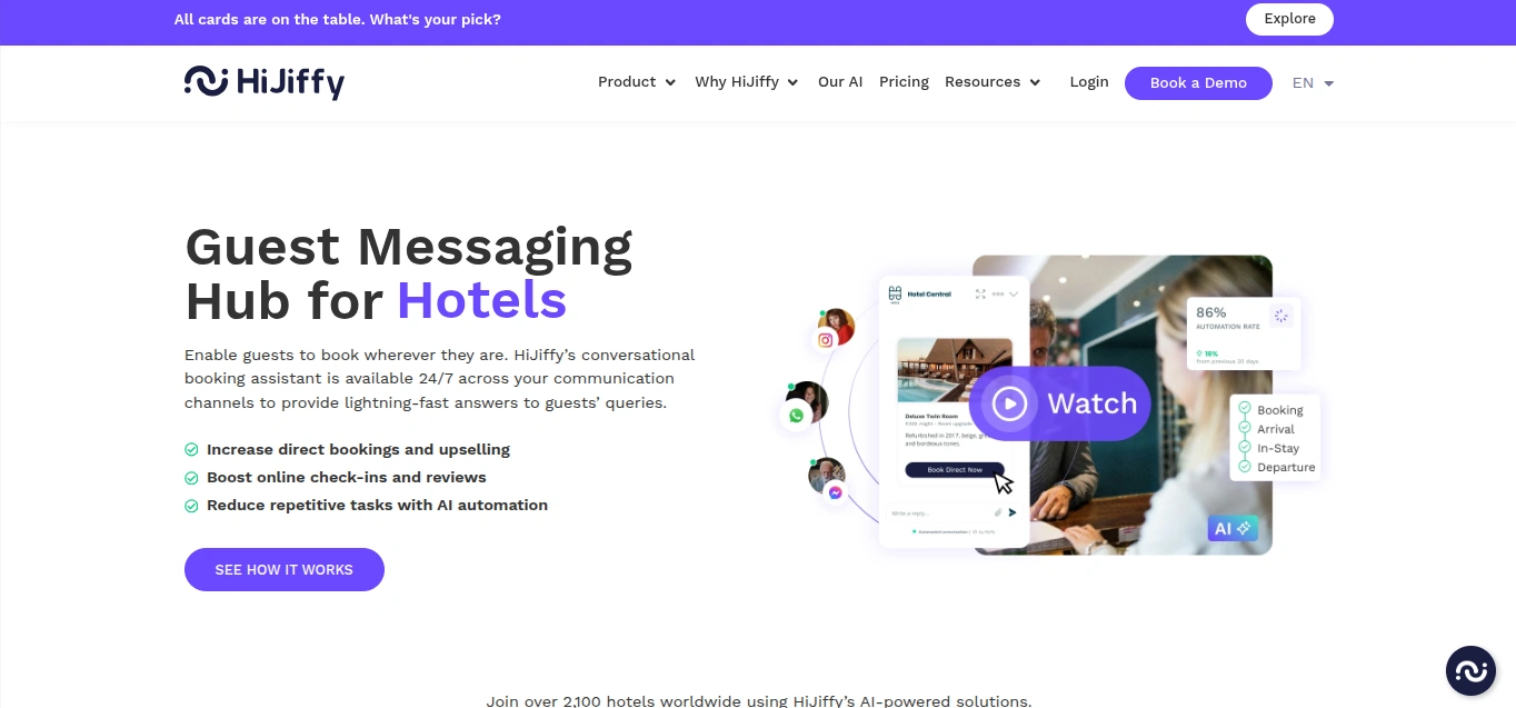 The software offers 24/7 assistance via voice, text, and web chatbots. The chatbot analyzes conversations and helps you build a marketing database for your hotel. This helps your team plan promotions and loyalty programs, and re-engage with guests to get more future bookings.