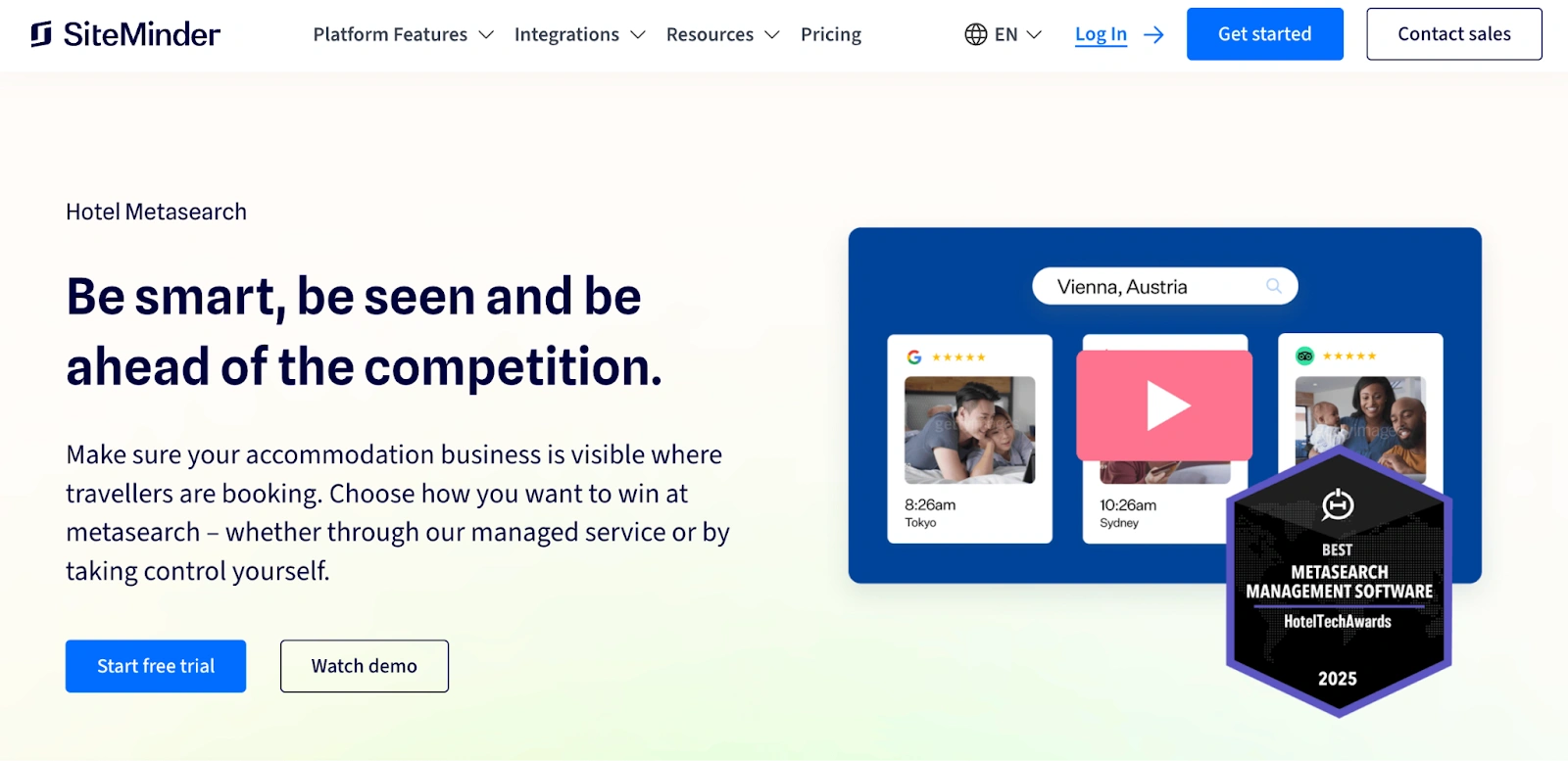 SiteMinder helps hotels grow bookings with smart metasearch management software solutions. You can choose expert-led campaigns with Demand Plus or self-manage with Metasearch Manager. Both options give hotels real-time price accuracy and performance insights across major travel platforms.