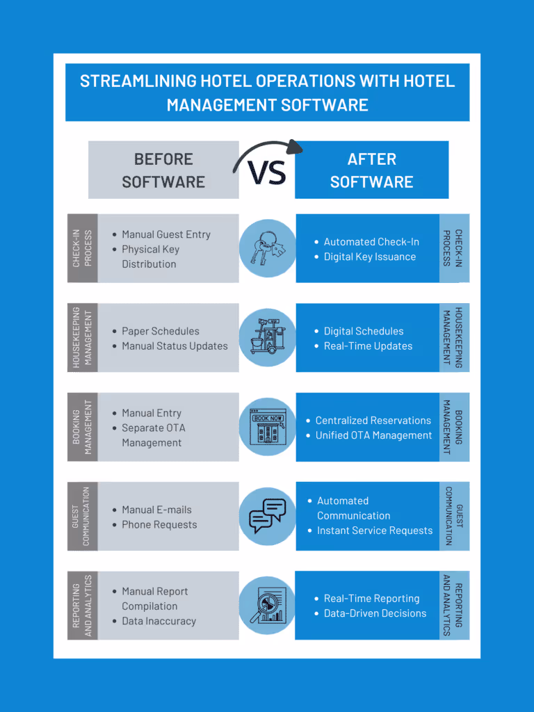 Hotel management software centralizes reservations, reducing errors and preventing overbookings.
