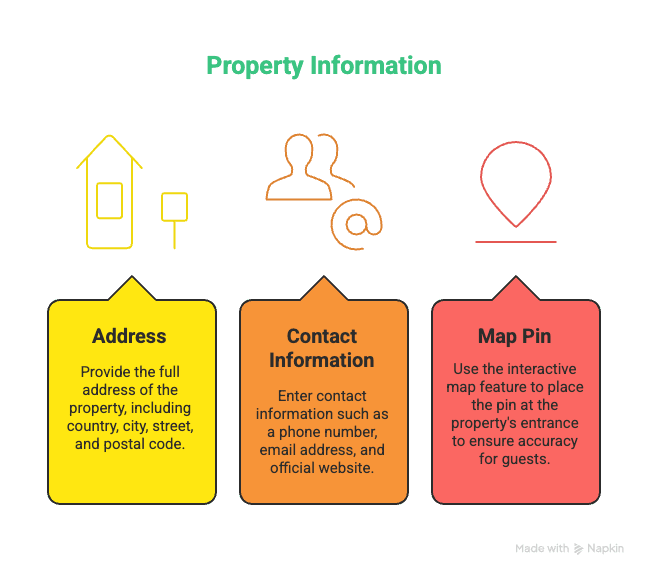 Provide the full address of the property, including country, city, street, and postal code. Enter contact information such as a phone number, email address, and official website. Use the interactive map feature to place the pin at the property's entrance to ensure accuracy for guests.