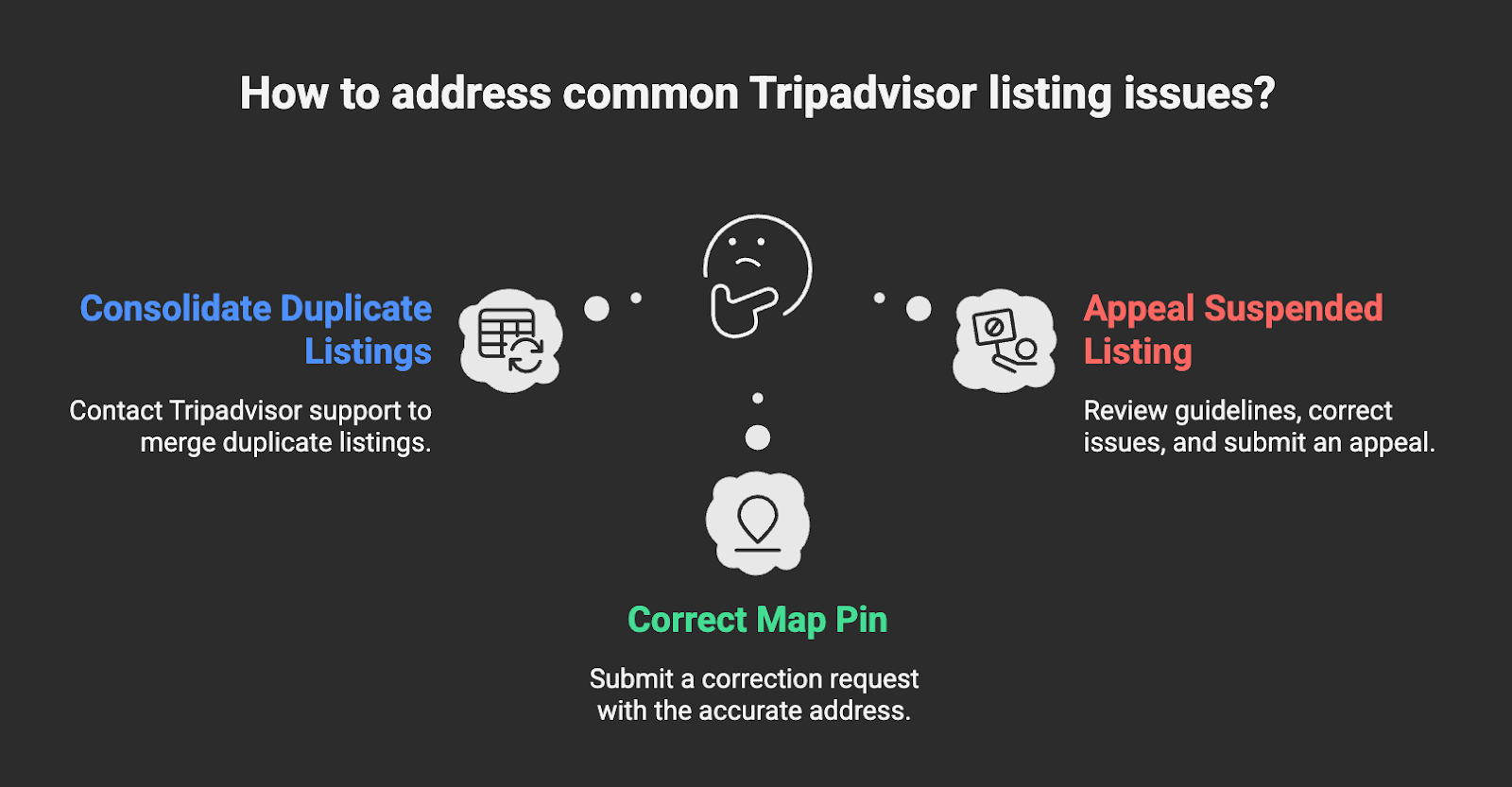 Duplicate listings: Duplicate listings occur when the same property is added to Tripadvisor more than once. When duplicates are identified, Tripadvisor usually merges the listings. Property owners can request consolidation by contacting Tripadvisor support through the Management Center.
