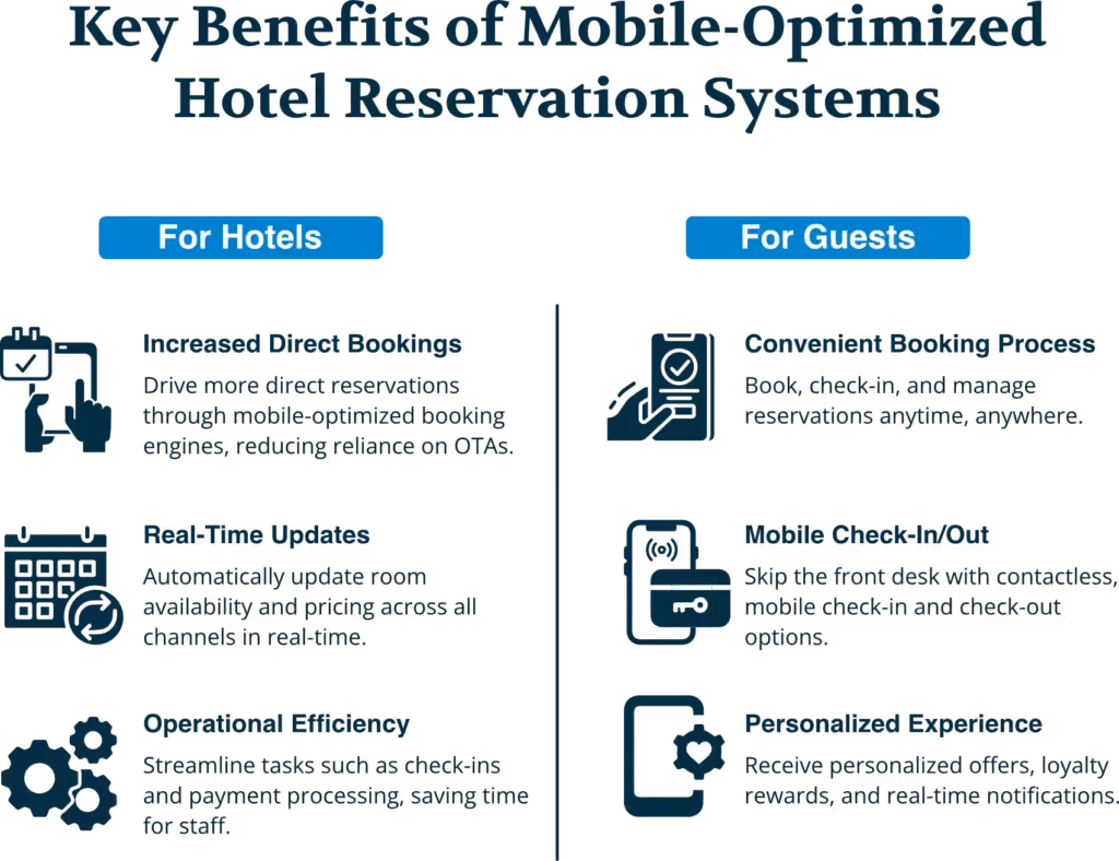 Mobile-friendly hotel reservation systems must go beyond basic booking functionality. Here are several features that make mobile accessibility a game-changer for hotels: