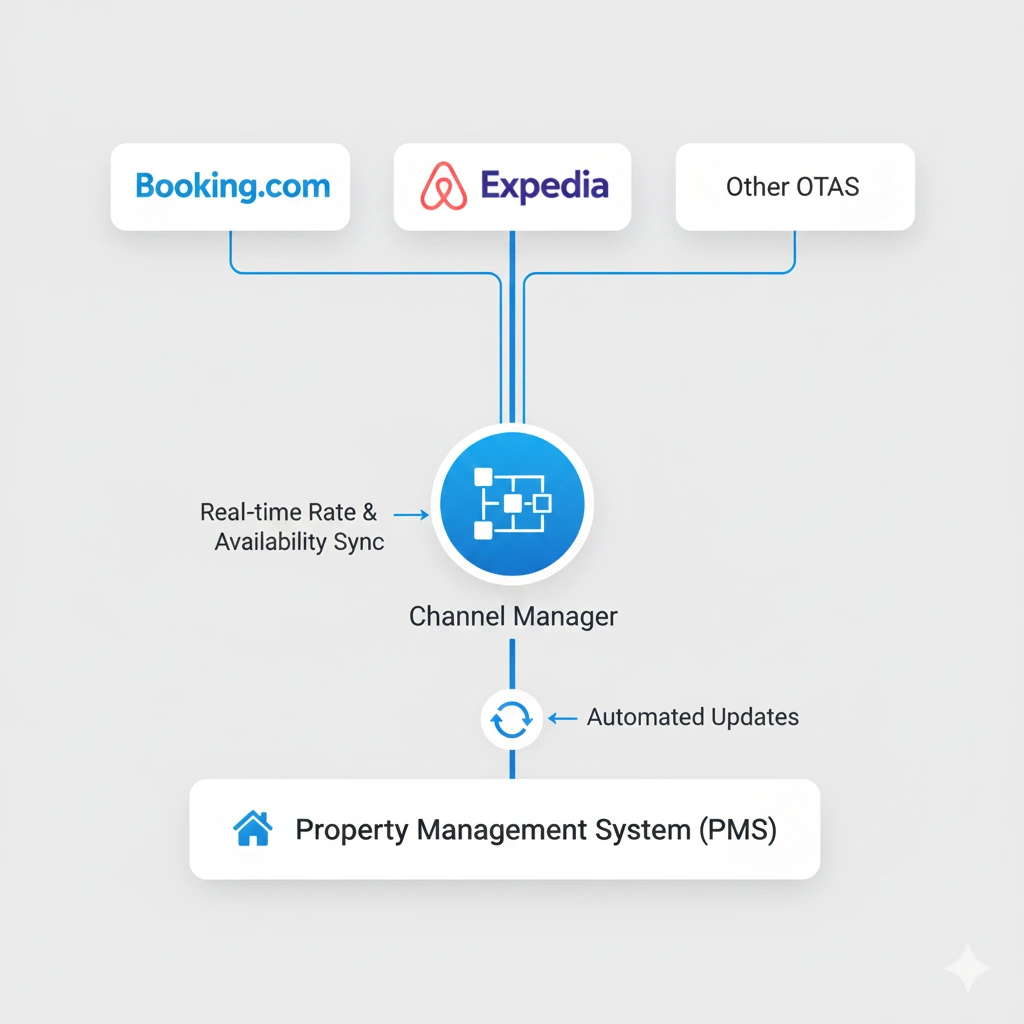 A channel manager works by creating connected channels that synchronize automatically in two directions. When a guest books a room through any OTA or on your website, the room count updates instantly across all platforms.