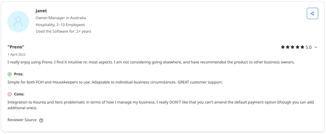 For example, a Capterra user noted that integrating Preno with Kounta and Xera has been challenging.