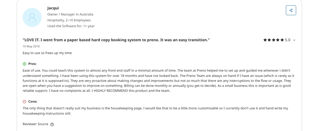 Users also mention a lack of advanced reporting and problems with multiple property management as some cons of Preno.
