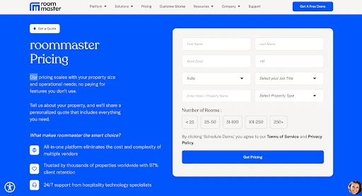 Instead of offering rigid tiers, roommaster pricing adapts to your property by calculating a custom quote based on hotel type, size, and location.