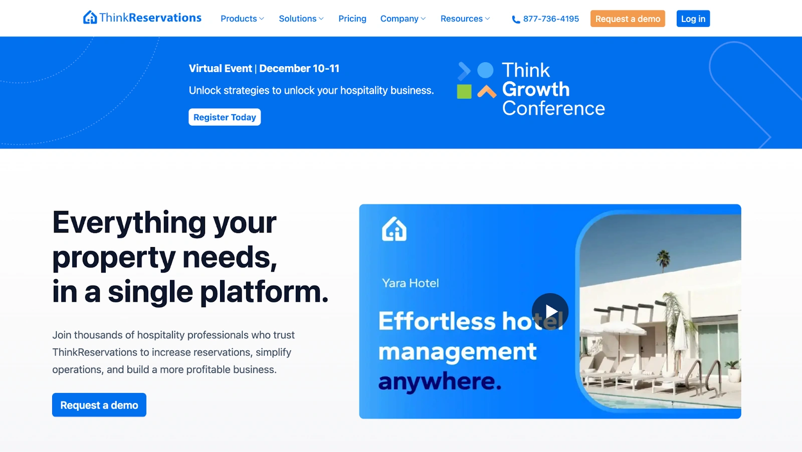 If you’re looking for a cloud-based property management system, ThinkReservations often stands out for small to mid-size hotels or inns. It is easy to learn, quick to implement, and streamlines reservations, room management, billing, housekeeping, and guest communications in a single, unified platform.