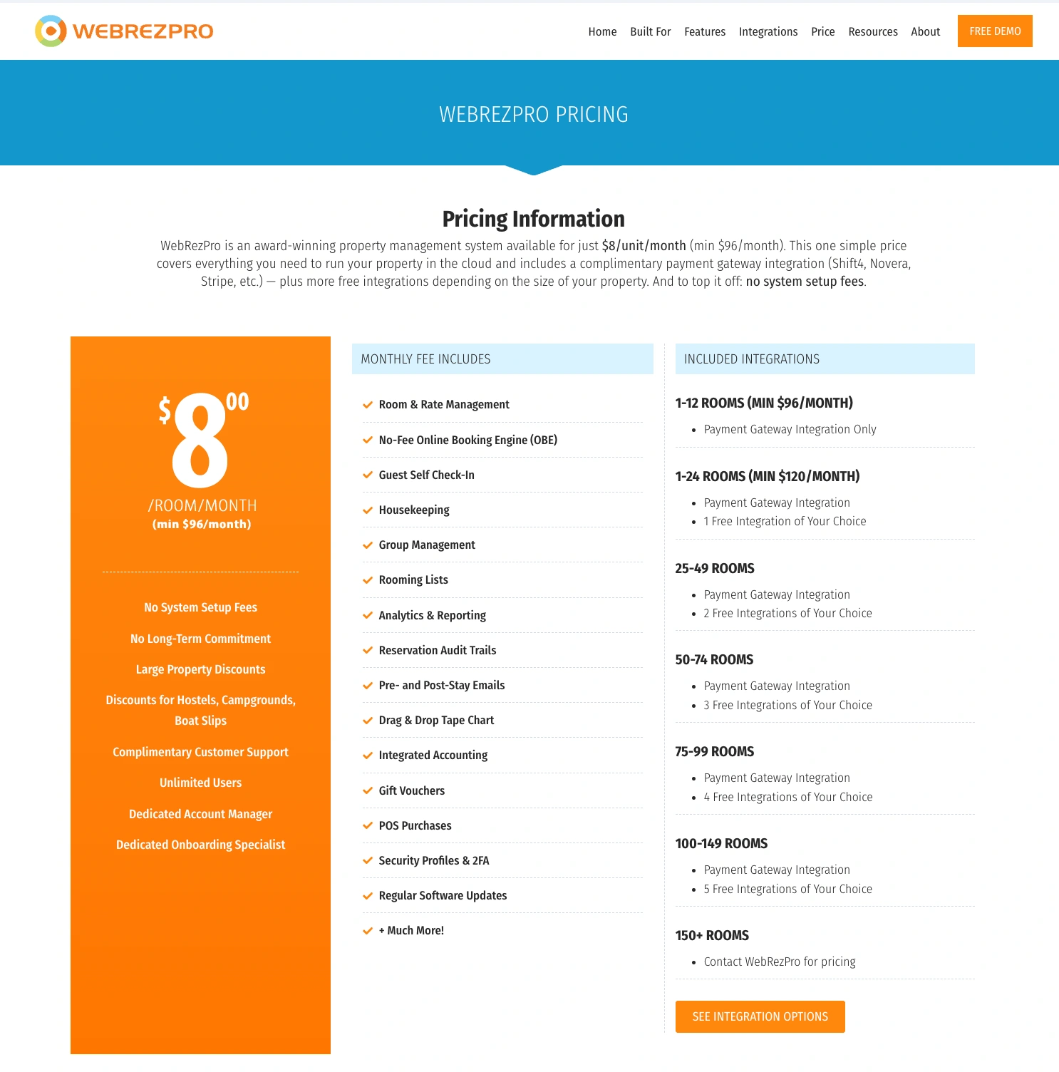 WebRezPro keeps pricing simple. Every property starts at $8 per unit per month, with a minimum monthly fee of $96, and the monthly fee already covers the core tools needed to run a property in the cloud. The plan includes a complimentary payment gateway integration, unlimited users, a dedicated account manager, and complete customer support at no extra cost.