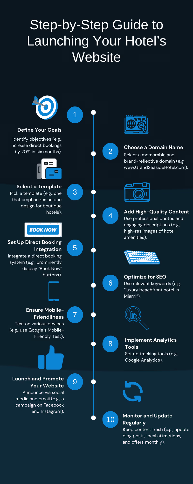 Identify what you want to achieve with your website. Are you looking to increase direct bookings, showcase your hotel’s unique features, enhance customer engagement, or improve your online visibility? Clear goals will guide the entire process.