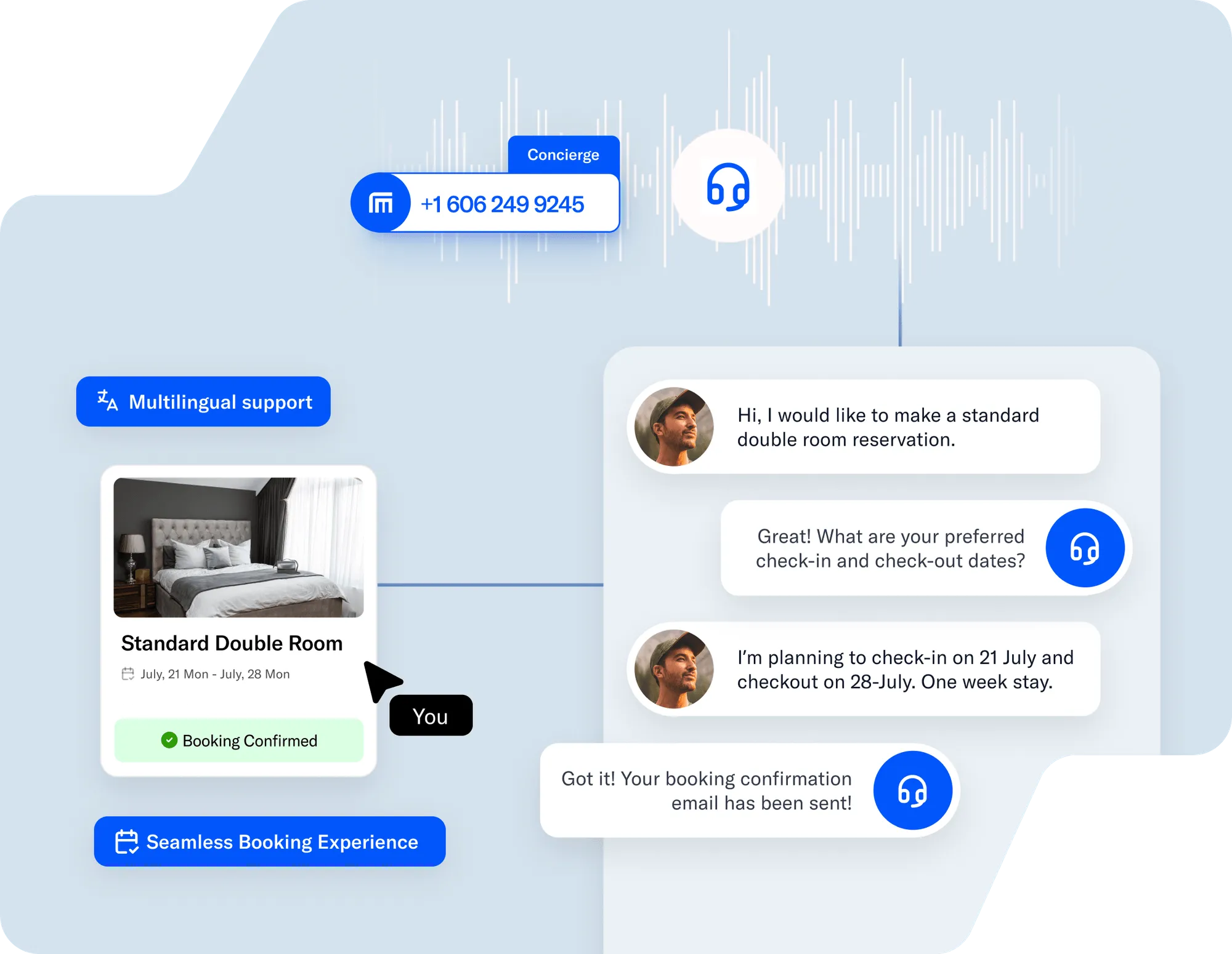 Answers availability, check-in times, and facilities questions 24 hours a day
